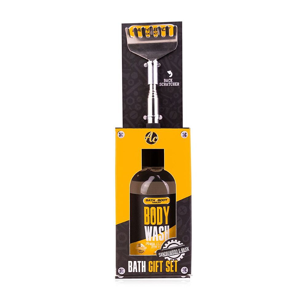 Set obsahuje nejen sprchový gel s osvěžující vůní santalového dřeva, ale také praktickou škrabku na záda s teleskopickou rukojetí.