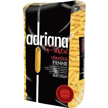 Součástí balení je 1 sáček o hmotnosti 500 g. Klíčové vlastnosti těstovin ADRIANA Penne Semolinové těstovinyObsahují mouku z pšenice tvrdéTrubkovitý tvar s vnějšími drážkami Vhodné pro podávání s masem, zeleninou, sýrem nebo omáčkouZaženou hlad a skvěle vypadají na talíři Složení Semolina - mouka z pšenice tvrdé Triticum durum. Výživové údaje Energetická hodnota: 1495 kJ / 357 kcalTuky: 1,9 g- z toho nasycené mastné kyseliny: 0,4 gSacharidy: 67,9 g- z toho cukry: 2,8 gBílkoviny: 13,1 gSůl: 0,01 g Podmínky uchování Skladujte v suchu a odděleně od aromatických látek. Původ a výrobce Původ: Česká republikaVýrobce: Europasta SEU Sila 246Boršov nad Vltavou