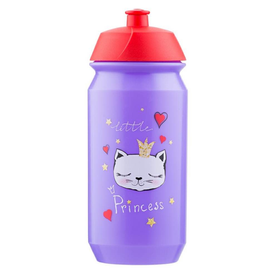 Fialová lehká láhev na pití s potiskem kočky a s objemem 500 ml.