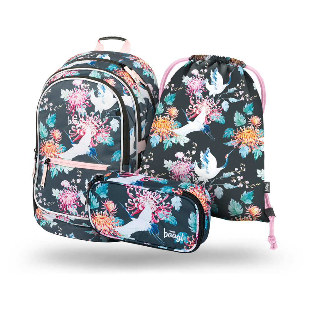 Dívčí set s něžným potiskem volavek a květin, je vhodný od 3. třídy ZŠ, ale také pro druhý stupeň ZŠ.