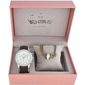Výrobce: BENTIME Dárková sada hodinek BENTIME BOX BT-11824A: Trendy dárková sada BENTIME BOX BT-11824A je skvělým dárkem pro každou ženu, která se ráda strojí a dává přednost nadčasové eleganci. V sadě naleznete stylový náhrdelník a hodinky oblíbené značky BENTIME. Módní bižuterní náhrdelník stříbrné barvy vás na první pohled okouzlí přívěškem a kombinací kovu a kůže. Na vašem dekoltu se bude nádherně vyjímat a perfektně podtrhne váš vzhled. Klíčové vlastnosti trendy dárkové sady BENTIME BOX BT-11824A s hodinkami a náhrdelníkemDárková sada BENTIME obsahující dámské hodinky a náhrdelníkMódní bižuterní náhrdelník v kombinaci kovu a kůžePřívěšek osázený krystaly Analogové hodinky BENTIME se stříbrným pouzdremMinerální sklíčko odolá škrábancůmNapájení pomocí baterie a strojku Quartz3 subciferníkyVteřinová ručičkaWater resistant Krása a elegance ruku v ruce s kvalitouDámské analogové hodinky BENTIME jsou poháněny quartz bateriovým strojkem. Mají minerální sklíčko, tudíž se nemusíte bát, že si hodinky odřete, vydrží vám po dlouhou dobu v perfektním stavu. Hodinky odolávají vlhku, můžete je tedy nosit také za deštivého počasí. Do stříbrného pouzdra je vložen bílý ciferník se 3 subciferníky a vteřinovou ručičkou. Hodinky jsou zdobeny logem BENTIME. Stylový módní doplněk i každodenní pomocníkDámské módní hodinky BENTIME se vyznačují elegantním designem. Jako nádherný šperk ozdobí vaše zápěstí a dokonale doladí outfit. Jsou vhodné jak pro společenské události a kulturní akce, tak i pro večerní setkání s přáteli. Průměr ciferníku:36 mm