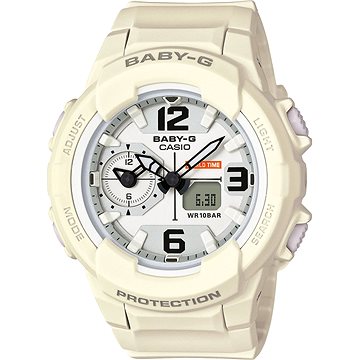 Výrobce: CASIO Dámské hodinky CASIO BGA-230-7B2ER: CASIO BGA-230-7B2ER jsou stylové dámské náramkové hodinky pro sportovně založené ženy. Hlavní čas zobrazuje analogový ciferník, pokročilé funkce využívají displeje. Hodinky jsou nárazuvzdorné. Materiál řemínku i pouzdra je pryž a plast. Ciferník o průměru 42,9 mm kryje odolné minerální sklo, které je tvrzené. Hodinky pohání quartz strojek s vloženou baterií. Vodotěsnost hodinek odpovídá 10 ATM, která dovoluje s hodinkami i plavat. Aby bylo vidět na čas i ve tmě, mají hodinky LED osvětlení. Z pokročilých funkcí hodinky nabízejí například plně automatický kalendář a světové časy. Klíčové vlastnosti dámských hodinek CASIO BGA-230-7B2ERSportovní dámské hodinky s analogovým i digitálním ciferníkemKrémová barevná kombinaceLED osvětlení, aby bylo na čas vidět i ve tměPrůměr pouzdra je 42,9 mmPokročilé funkce - automatický kalendář, světové časyVoděodolnost 10 ATM - s hodinkami můžete dokonce i plavatMinerální sklo je tvrzené a odolné proti poškrábáníQuartz strojek s vloženou bateriíMateriál řemínku i pouzdra je pryž a plastModel CASIO BGA-230-7B2ER jsou hodinky pro ženy, které jsou sportovně založené