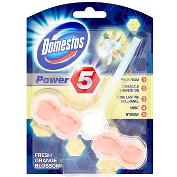 WC blok DOMESTOS Power 5 Pomerančový květ 55 g: WC blok DOMESTOS Power 5 Pomerančový květ je vším, co vaše toaleta potřebuje, aby si zachovala perfektní čistotu a svěží vůni.
