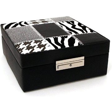 Výrobce: JK BOX Šperkovnice JK BOX SP-558/A25: Tip na originální dárek pro ženy a dívky! Tato šperkovnice jistě udělá radost každé ženě, která má ráda šperky a chce je mít přehledně uložené. Rozhodně zaujme i zajímavý design v imitaci kůže v černo-bílé barevné kombinaci.Tip na originální dárek pro ženy a dívky! Tato šperkovnice jistě udělá radost každé ženě, která má ráda šperky a chce je mít přehledně uložené. Rozhodně zaujme i zajímavý design v imitaci kůže v černo-bílé barevné kombinaci. Šperkovnice má vnitřní uspořádání do mnoha přihrádek, které jsou různě upravené dle svého účelu. Z vnitřní strany víka je umístěno praktické zrcátko. Klíčové vlastnostiOriginální designRozměry 185×205×80 mmObsahuje praktické zrcátkoŠperkovnice je uzamykatelnáCelkem pět různých přihrádekMožnost přehledně uložit velké množství drobností