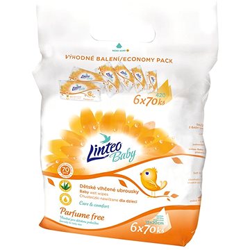 Dětské vlhčené ubrousky LINTEO BABY Vlhčené ubrousky PARFUME FREE v sáčku (6× 70 ks): Jemné dětské vlhčené ubrousky Linteo Parfume Free ze série Linteo Baby ošetřují dětskou pokožku a chrání před vznikem opruzenin.