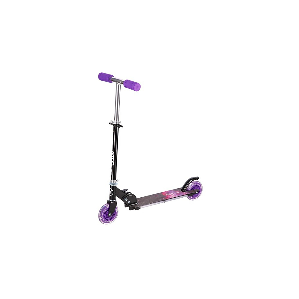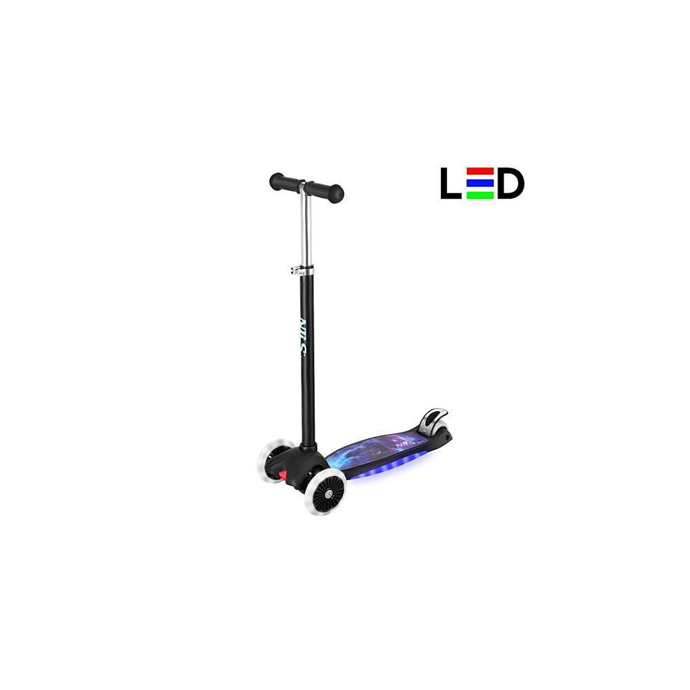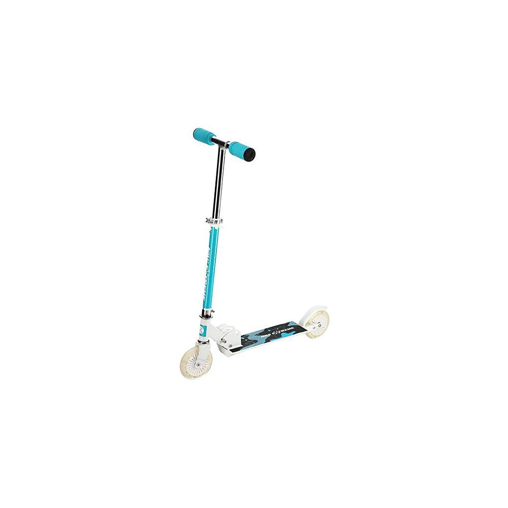 Lehká skládací koloběžka v zelené barvě, s 120 mm kolečky, nastavitelnými řídítky a protiskluzovou platformou.