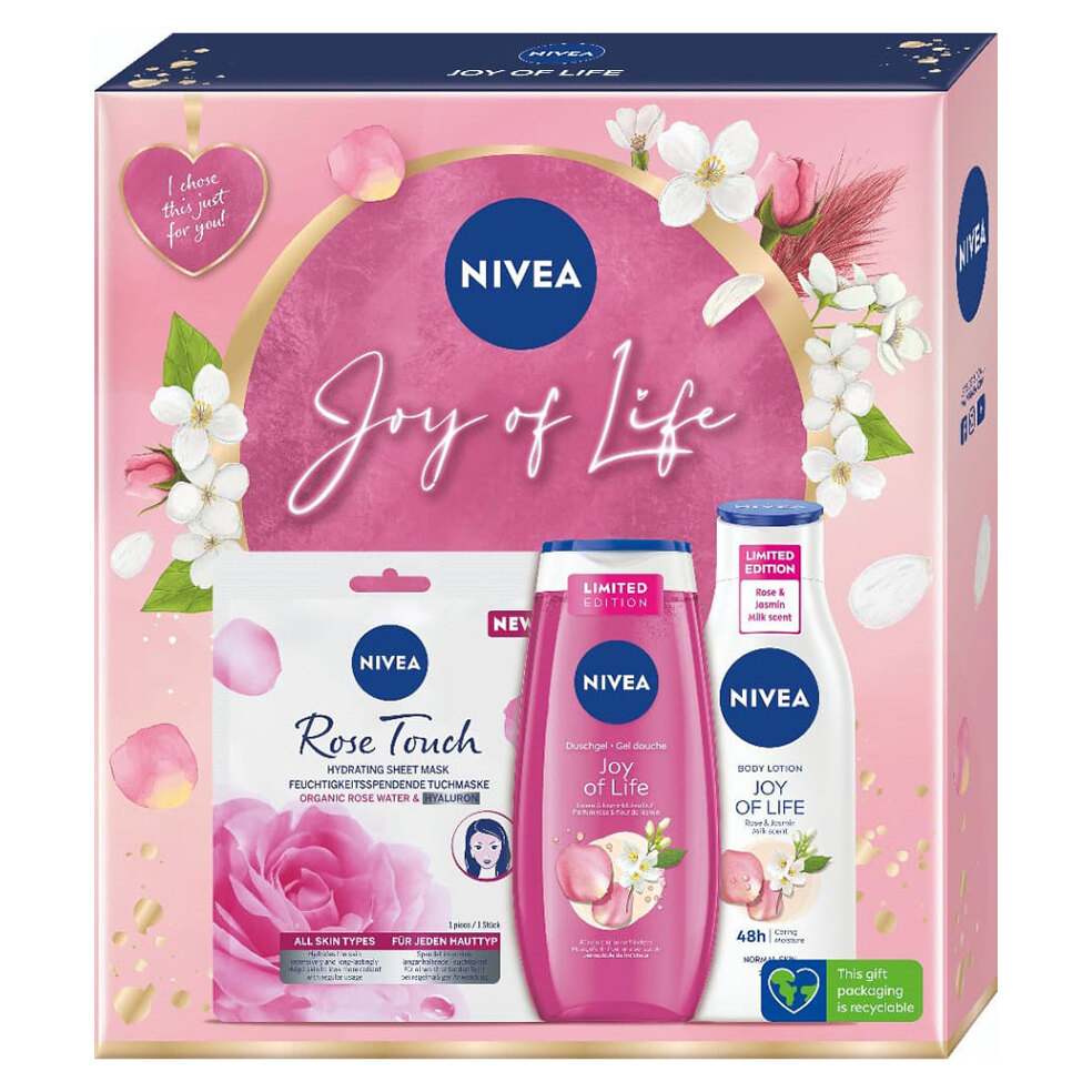NIVEA Joy of Life Box Sprchový gel 250 ml + tělové mléko 250 ml + textilní maska 1 kus Dárkové balení