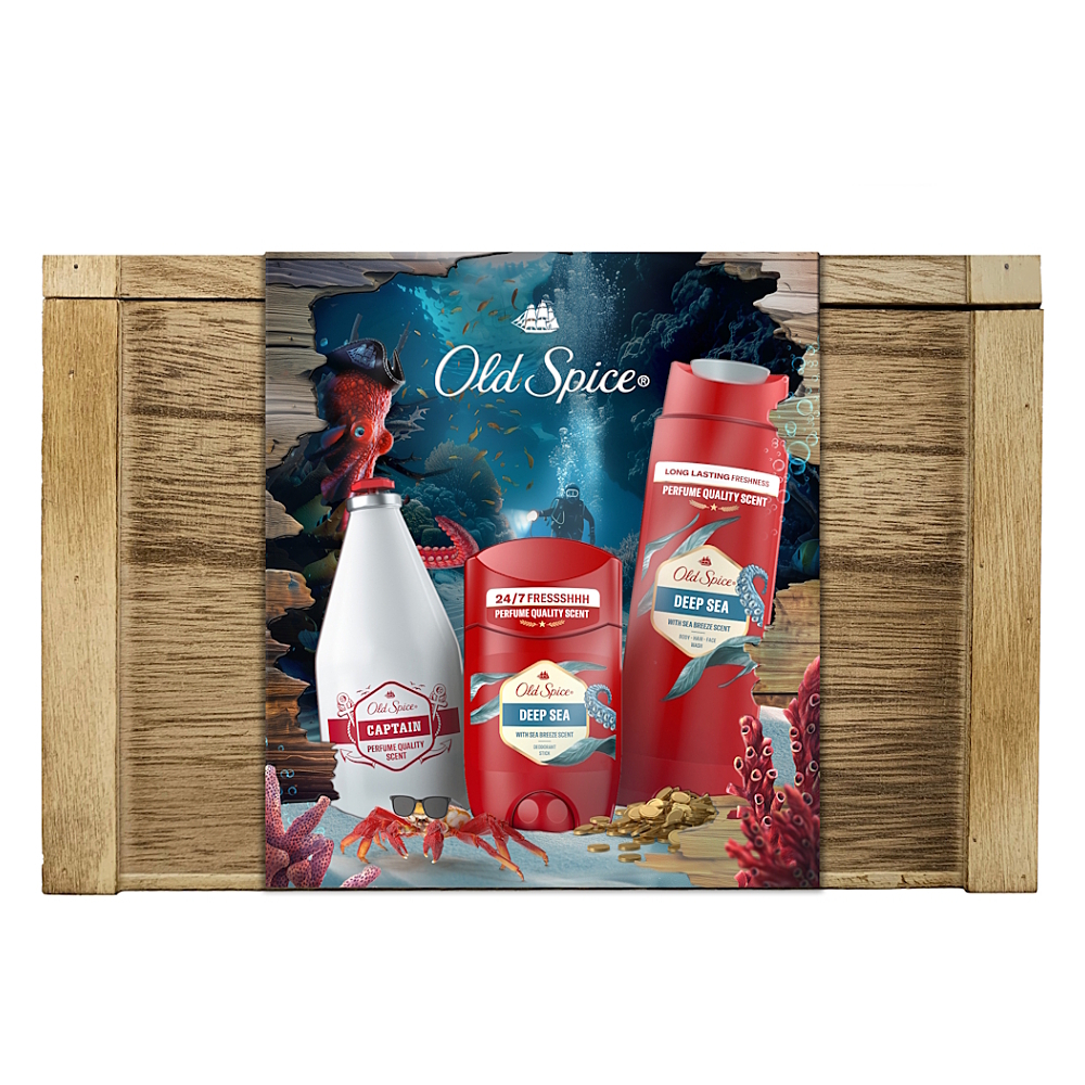 Old Spice Deep Sea sada deostick 50 ml + sprchový gel 3v1 250 ml + voda po holení 100 ml + dřevěná truhlička