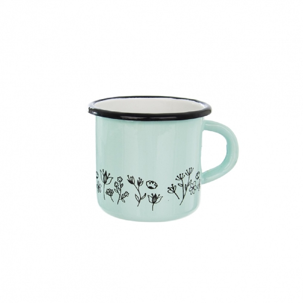 Retro hrnek ze smaltu v pastelově zelené barvě s jemným vzorem květin.