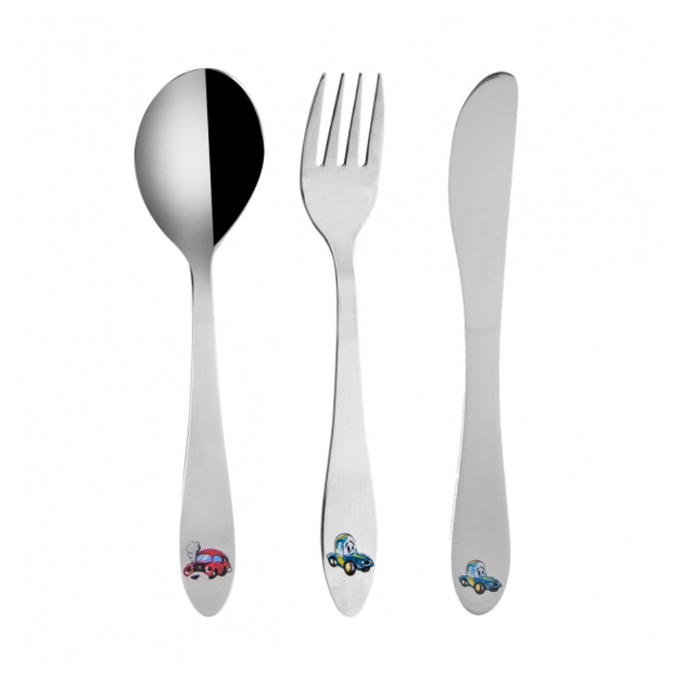 Set dětských nerezových příborů s barevným motivem autíček obsahuje lžíci, vidličku a nůž a je určen pro každodenní používání.