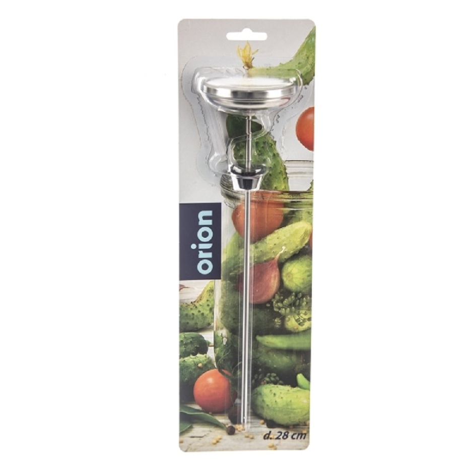 Nerezový teploměr na zavařování s průměrem ciferníku 7,5 cm a celkovou délkou 28 cm.