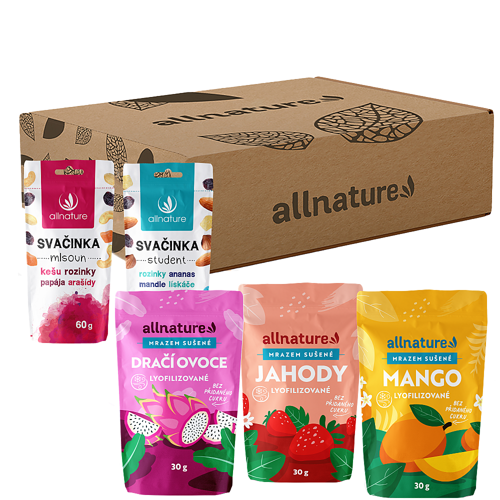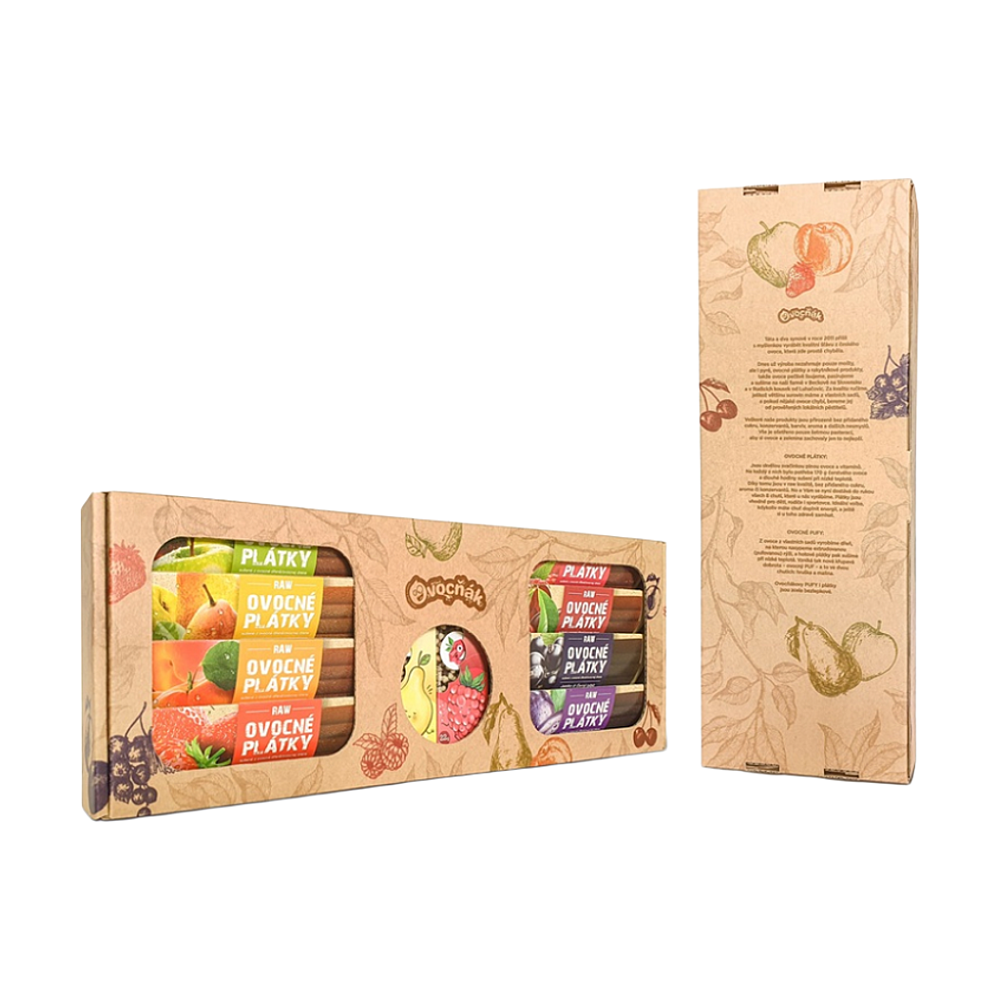 Dárková bonboniéra v podobě 8 balení ovocných plátků a navíc i 2 balení křupavých PUFů z hrušek a malin, vhodné pro vegany.
