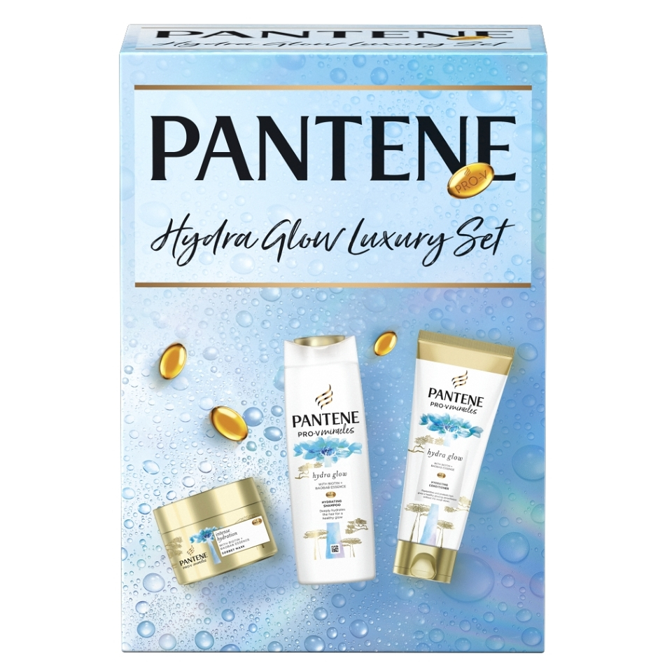 Dárková Sada Pantene Hydra Box obsahuje Šampon 300 ml, Hloubkový kondicionér 200 ml a Masku 160 ml.
