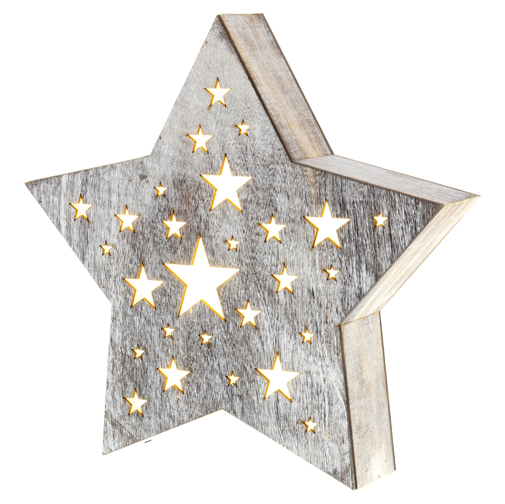 Dřevěná hvězda s hvězdičkami a perforací ve tvaru hvězdiček.