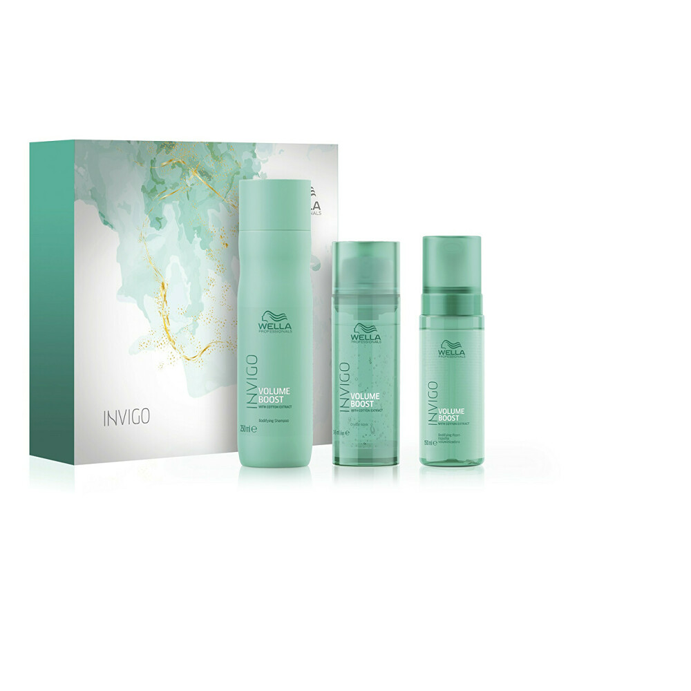 Dárkové balení obsahuje Wella Professionals Invigo Volume Boost šampon na vlasy 250ml, maska na vlasy 145ml, bezoplachová pěna na vlasy 150ml